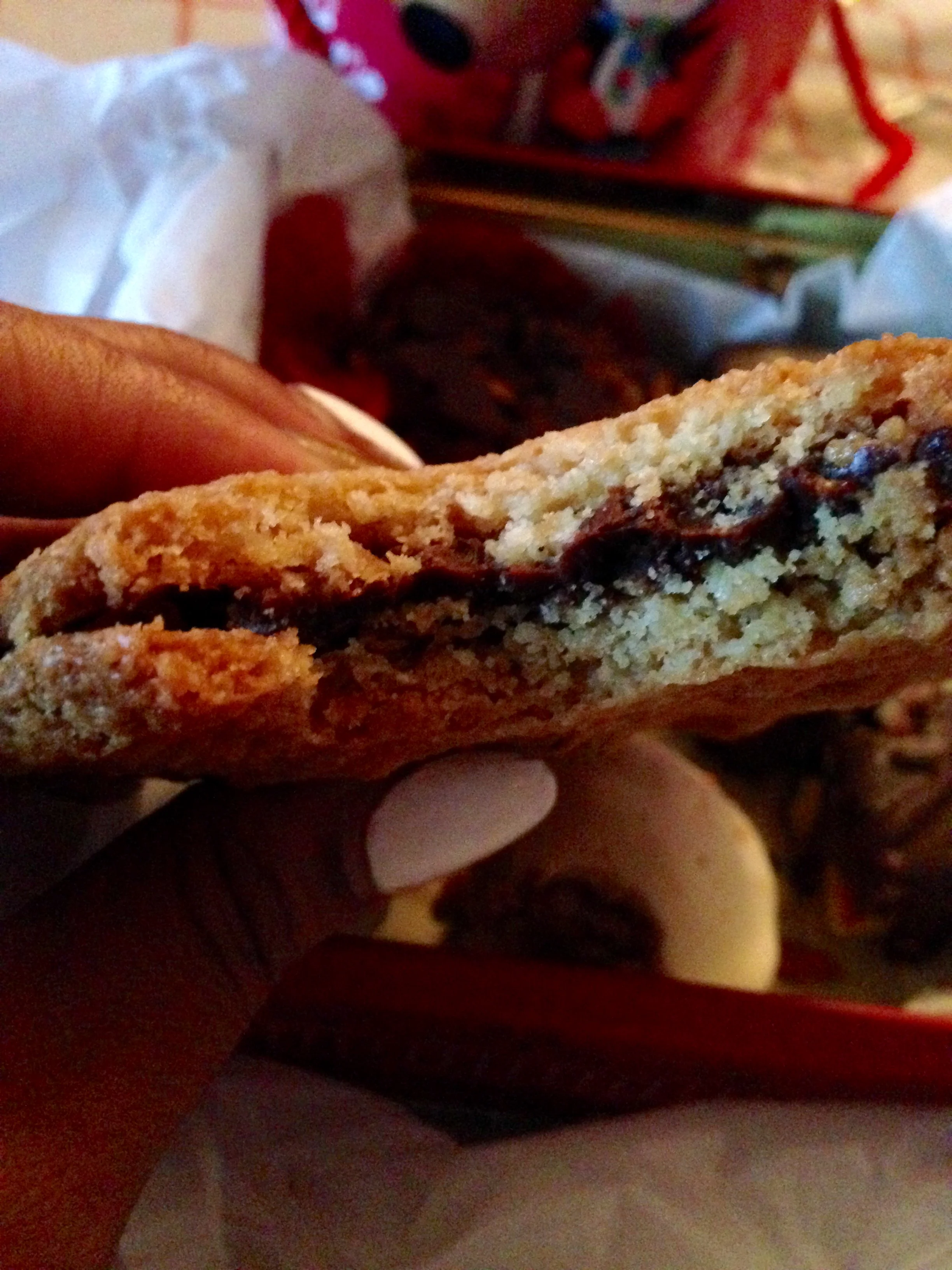 I was very lucky to have some special goodies delivered earlier this month. I couldn't wait to dig in! After receiving my baked goods, the first thing I noticed was the cute packaging! There was an adorable red container with a reindeer and snowflakes on it with a clear top. If baked goods are delivered in cute packaging like this all the time, I would be ordering at least every other week! It's just something about cute packaging that makes you feel special! Cookies were stored inside. They were chocolate chip sandwich cookies (2 cookies with a layer of ganache). WOW! These cookies were awesome! They were slightly big and very tasty. It had the right amount of ganache in the middle and the cookies itself were delicious. I can honestly say that these were some of the best cookies I've ever tasted.