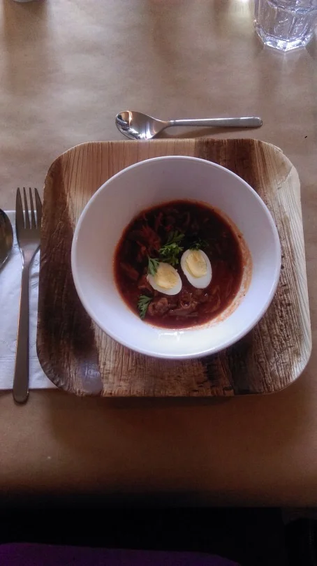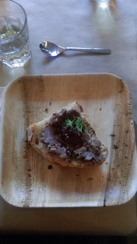 For the second course, we were served Potted Venison with bread and topped with red currant jelly. I learned that back then, potting things (foods) was common. You would spice and bake the meat to kill bacteria, grind it and pack it. Then it would be sealed with a layer of butter or animal fat. This was all researched by Claire, very impressive. Well anyways, I enjoyed it. The bread was extremely fresh and soft, and the venison was delicious. The currant jelly was a perfect topping as well.