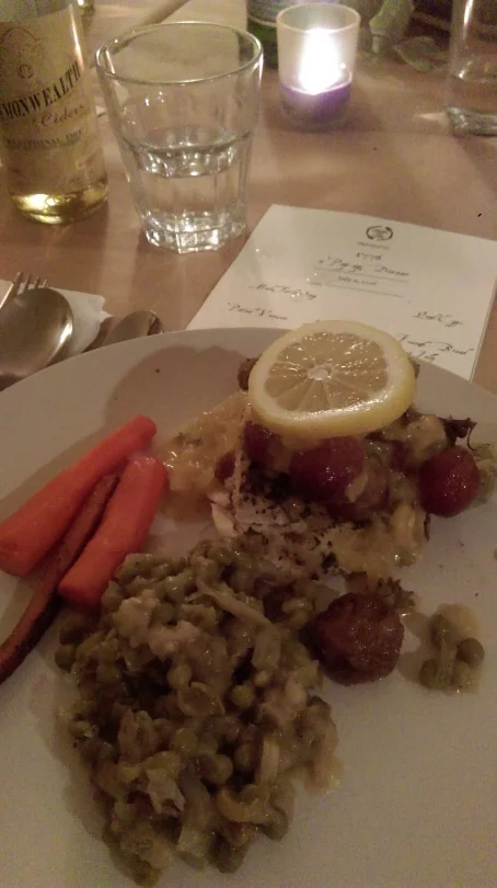 Fourth course was chicken dressed the French way. The chicken was cooked in a lemon and wine sauce w/ artichokes, shallots, roasted grapes and mini veal meatballs. Goodness, I really enjoyed every bite of this meal. I ate the chicken with the grapes together, and the combination was superb. I would’ve never thought to ever roast grapes with chicken. I’ve learned something new that I definitely will be trying at home now. Thanks Claire! The sides to this dish were buttered carrots seasoned with nutmeg and salt. And then we had Peas Francoise. It was cooked with cabbage, seasoned well and it was also done with a roux.