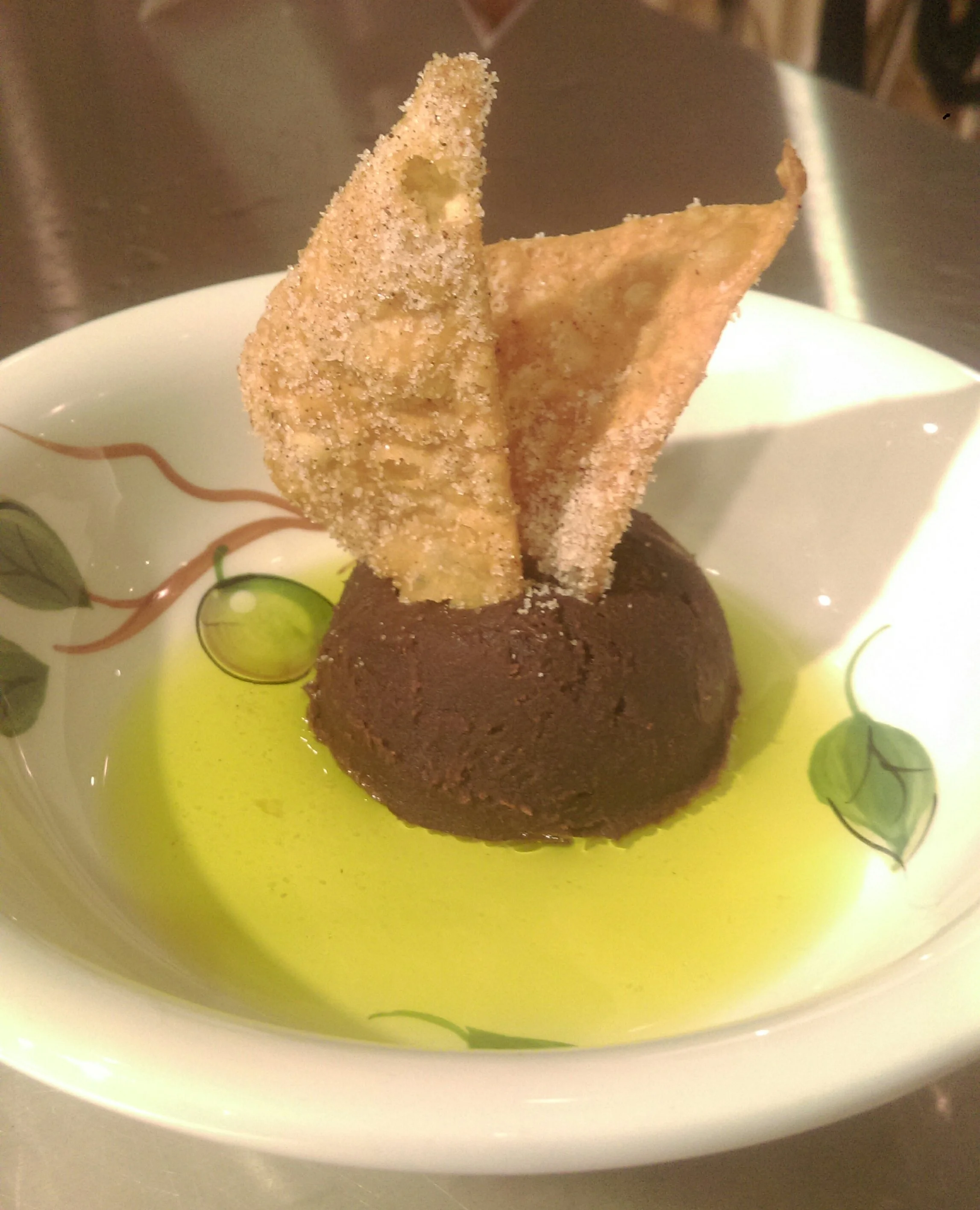 The third course was up next. This one was very unique and different. It was a chocolate ganache with olive oil. This was topped with a fried wonton flavored with chipotle, cinnamon, sugar and little bit of salt. The combination of the chipotle, sugar and cinnamon made the fried wonton very enjoyable. It had the right amount of sweetness and in the end you experienced a nice, light bit of heat. I also enjoyed the texture and flavor of chocolate ganache with the olive oil. This was executed very well.
