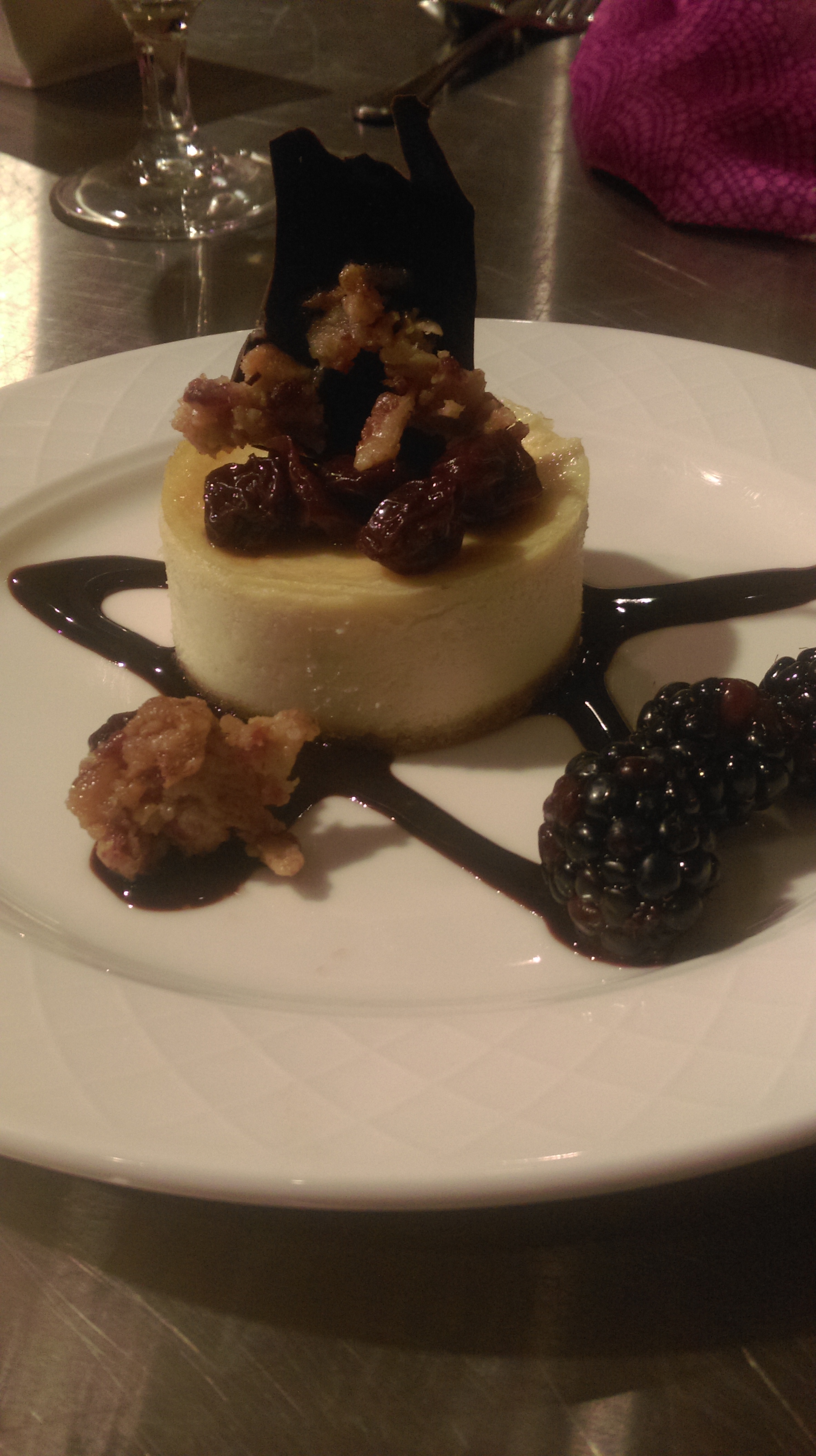 Chef Dana broke this up into pieces. It was going to be used to top the cheesecakes. First, chocolate syrup was drizzled around the plates. Then he began to top the cheesecakes with cherries, and then topped them with the chocolate and bacon. Lastly, the plates were garnished with blackberries and even more bacon. This dish was almost too pretty to dig into! Everything blended perfectly together. From the berries to the bacon, every single bite was outstanding.