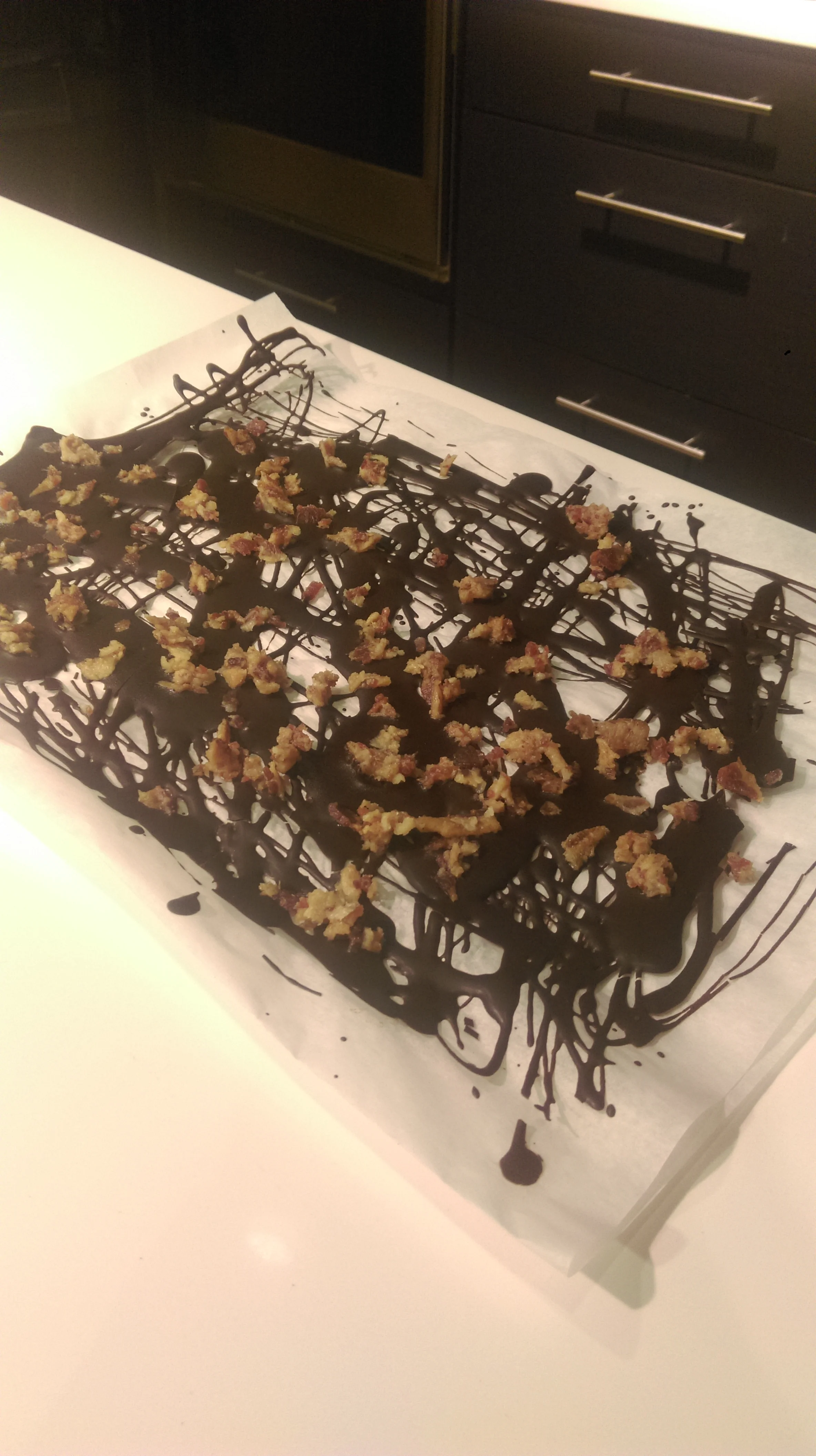 It was time to move on to the second course. Next was a peanut butter cheesecake with a graham cracker bacon crust. A few ingredients mentioned were sugar, cream cheese, vanilla and a little almond. There was more bacon in store for this course. How was more bacon going to be incorporated into this dish? Well, well, well….Chef Dana had a magnificent sheet of chocolate and bacon! It was so beautiful and so tempting! I could’ve eaten that as is, that’s how good it looked!