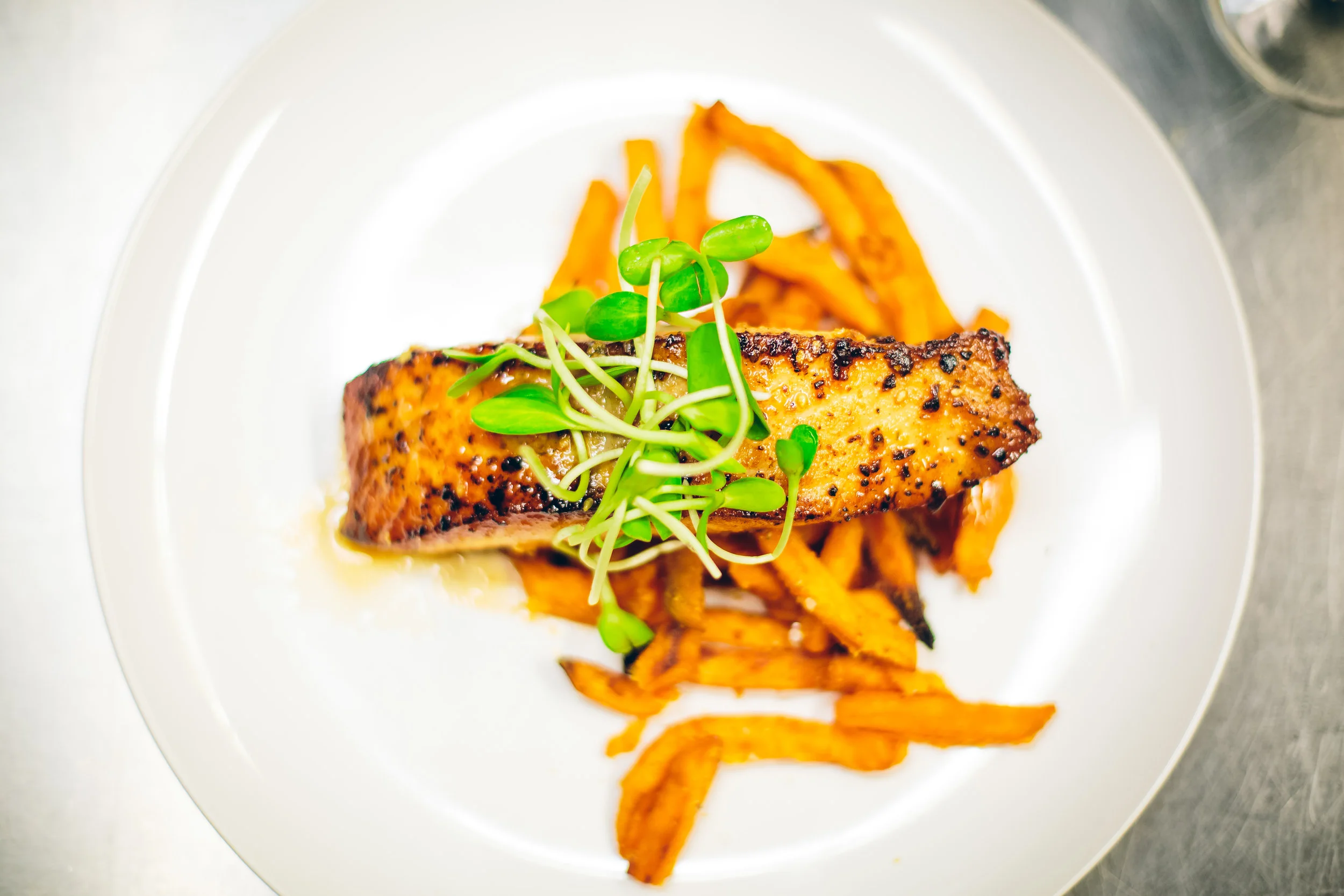 Next, we were served a sweet and spicy sriracha glazed salmon with sweet potato fries. I think this dish was my favorite dish of the evening. I really enjoyed the flavor of the glaze and the salmon was cooked PERFECTLY. It wasn’t dry at all and the portion was great. I would’ve never thought to pair it with sweet potato fries, but surprisingly it went exceptionally well together! Along with the salmon, we were also served a vegetable stir fry. This was the last dish. It’s always nice to end a meal with a light, tasty and healthy option!