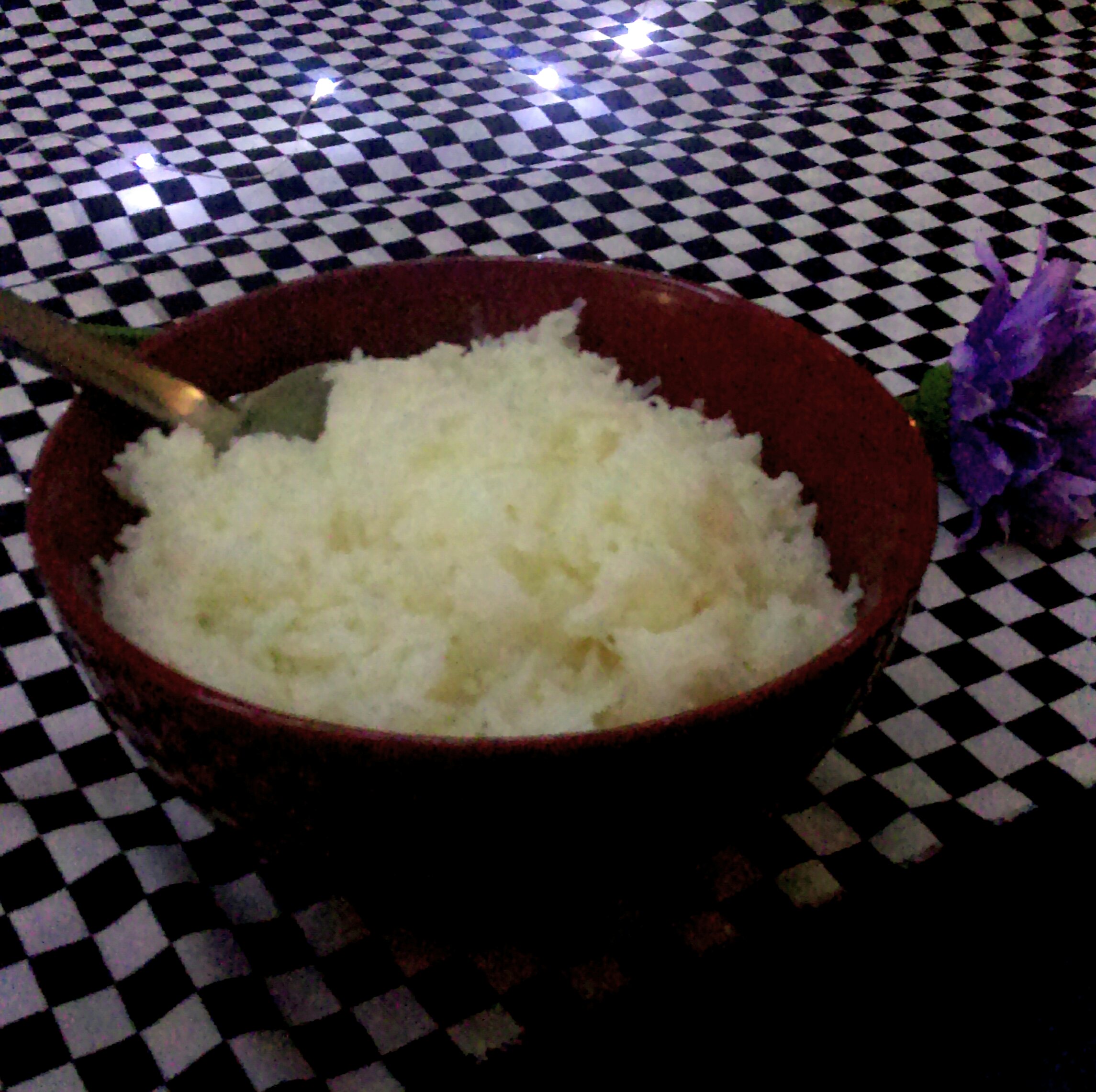 It was time for the third course. Orange chicken with scallions and sesame seeds. This course was delicious, the sauce had great consistency and I especially enjoyed the tenderness of the chicken. Coming up next was creamy coconut rice. This paired well with the orange chicken. By now, I’m feeling very proud of Tonia. Tonight was visibly a success and the night wasn’t over yet. We still had a few more things ahead of us to enjoy and so far everything was wonderful.