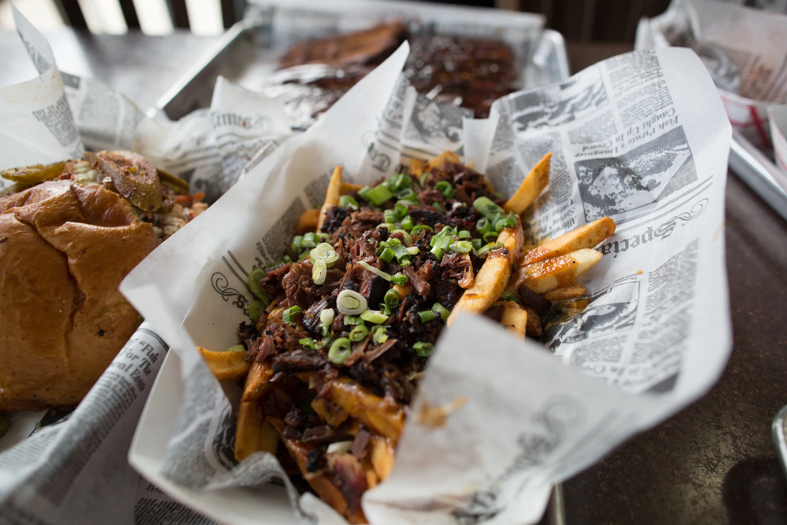 Next, I dove into their Tennessee Tornado Sam'ich. This is made with their grilled Southern sausage, pulled pork, grilled onions, slaw, dry rub and a delicious mustard BBQ sauce. I loved this mustard BBQ sauce, it was a great addition to all the flavors I tasted within this sandwich. The third sandwich I tried was a spicy Texas Twister. This is made with pulled pork, brisket, pulled chicken, jalapeño, spicy BBQ sauce and topped with slaw. All three sandwiches were special in their own way, but the Notorious P.I.G. won my heart out of them all! They're all pretty large sandwiches, so bring your appetite when ordering one of these!