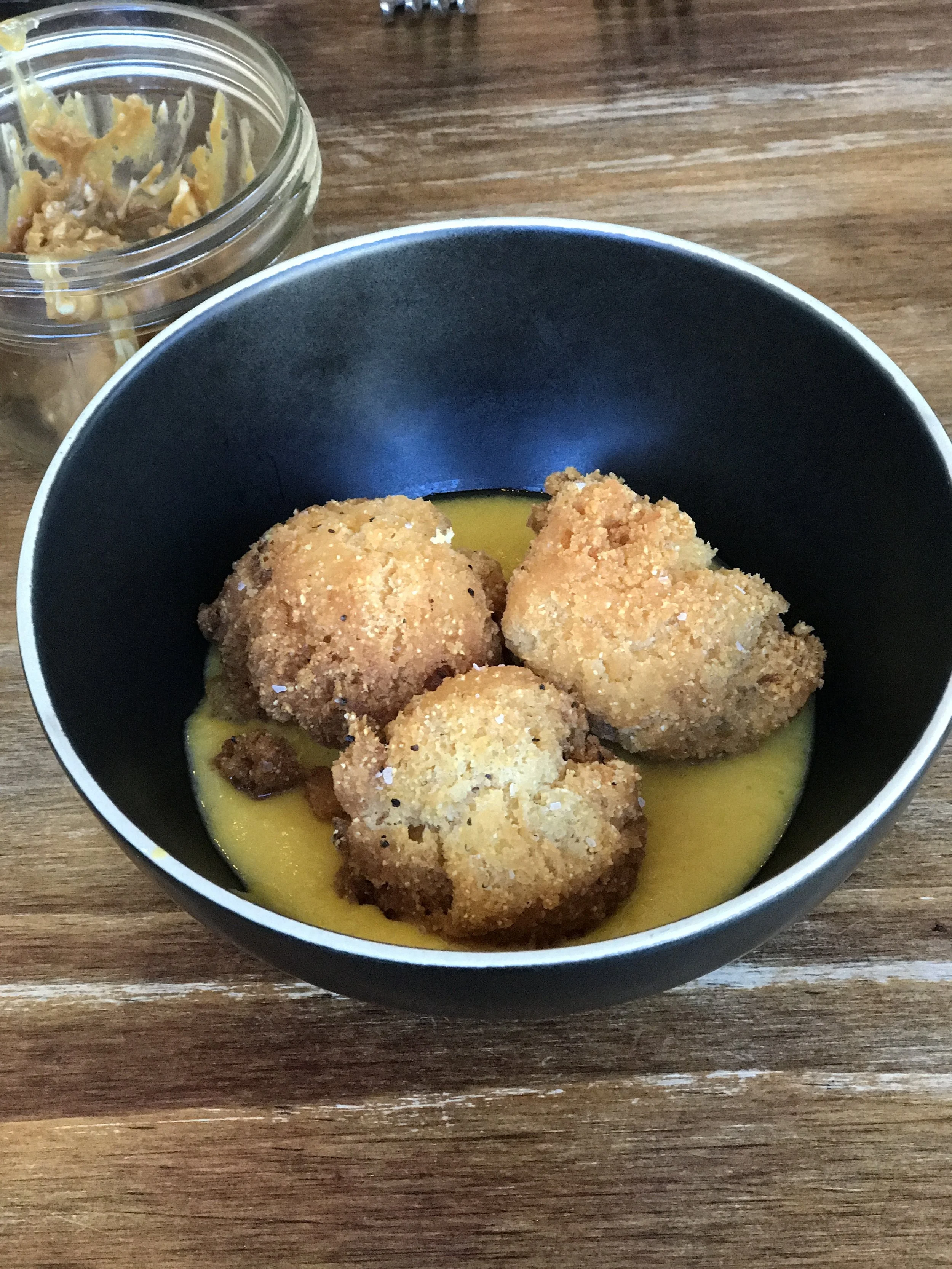 Brunch began with Sweet Potato Muffins paired with sweet molasses butter. The muffins were moist and fluffy. The butter was the perfect spread. You could really taste the molasses which I loved. Afterwards we moved on to the next course. We were served Hush Puppies in a sweet corn purée. I enjoyed these very much. The outer texture had just the right crisp with flakiness. Inside, it was moist and the flavor/seasoning of the hush puppies were delicious. The sweet corn purée was the icing on the cake for this course. It added color and a lot of flavor to the dish.