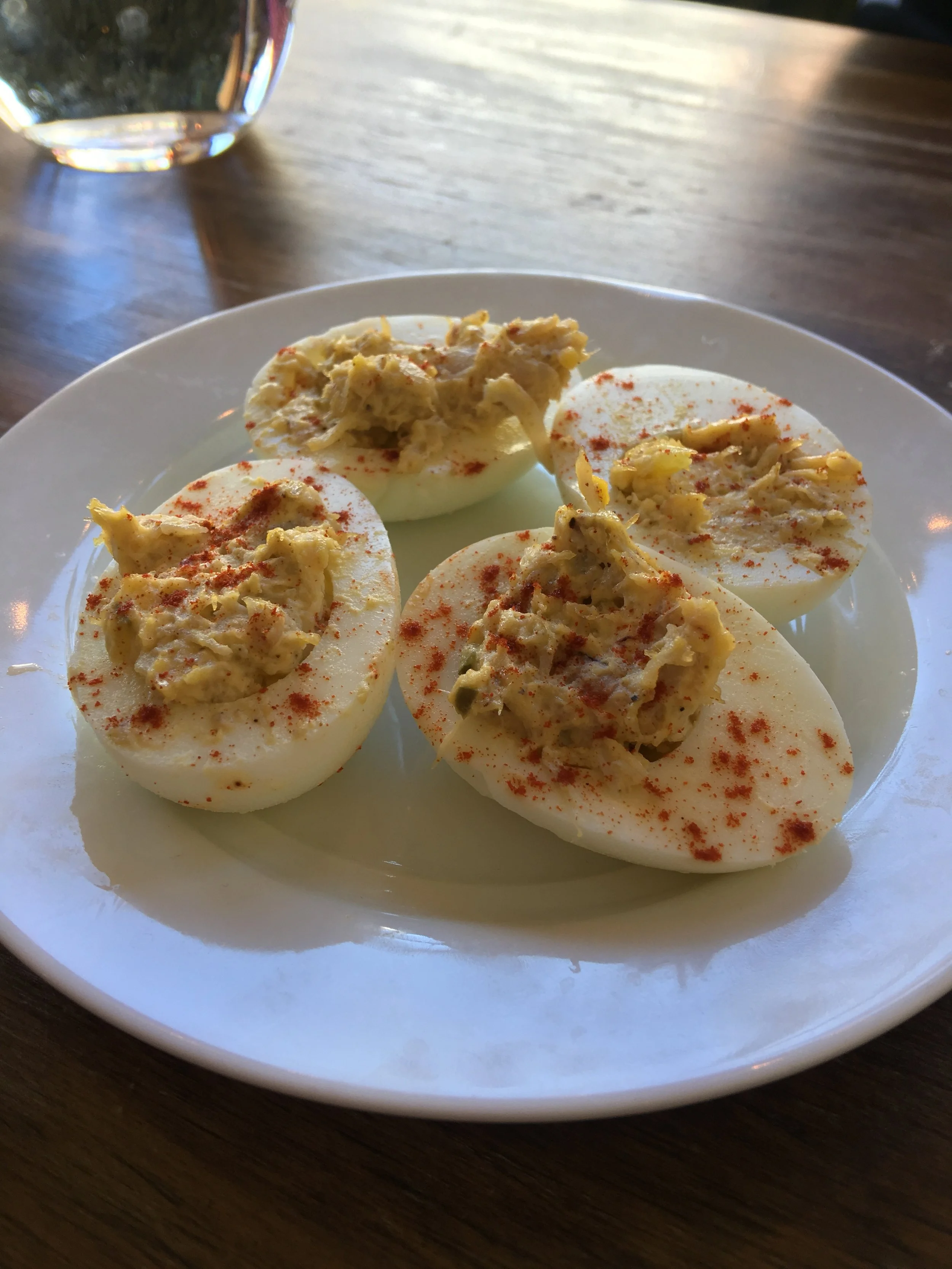 It was time for the third course. We were served Blue Crab Deviled Eggs. Only one word could describe them....FANTASTIC! I've always had a love for deviled eggs. The added crab just sent me through the roof! There isn't a thing I would change about them, loved them. I just wish I could've taken my own tray of them back home with me! Next up was a more heavier dish, Fish and Grits. The fish was fried perfectly, had a fresh taste and it wasn't greasy at all. The grits were creamy and delicious. This was one of the best fish & grits dishes I've ever tasted. Everyone can't cook good grits, but Chef Thomas did them right.