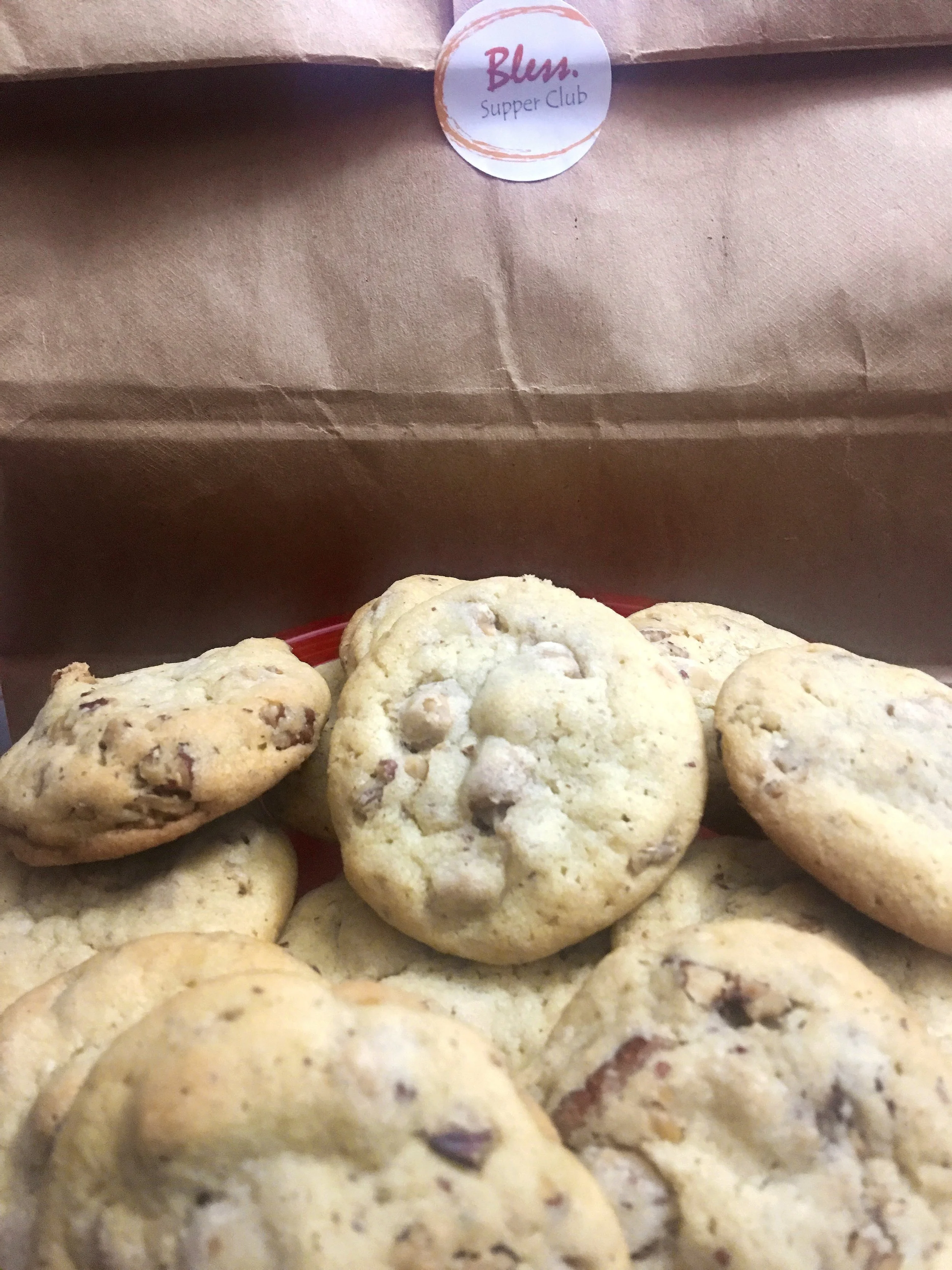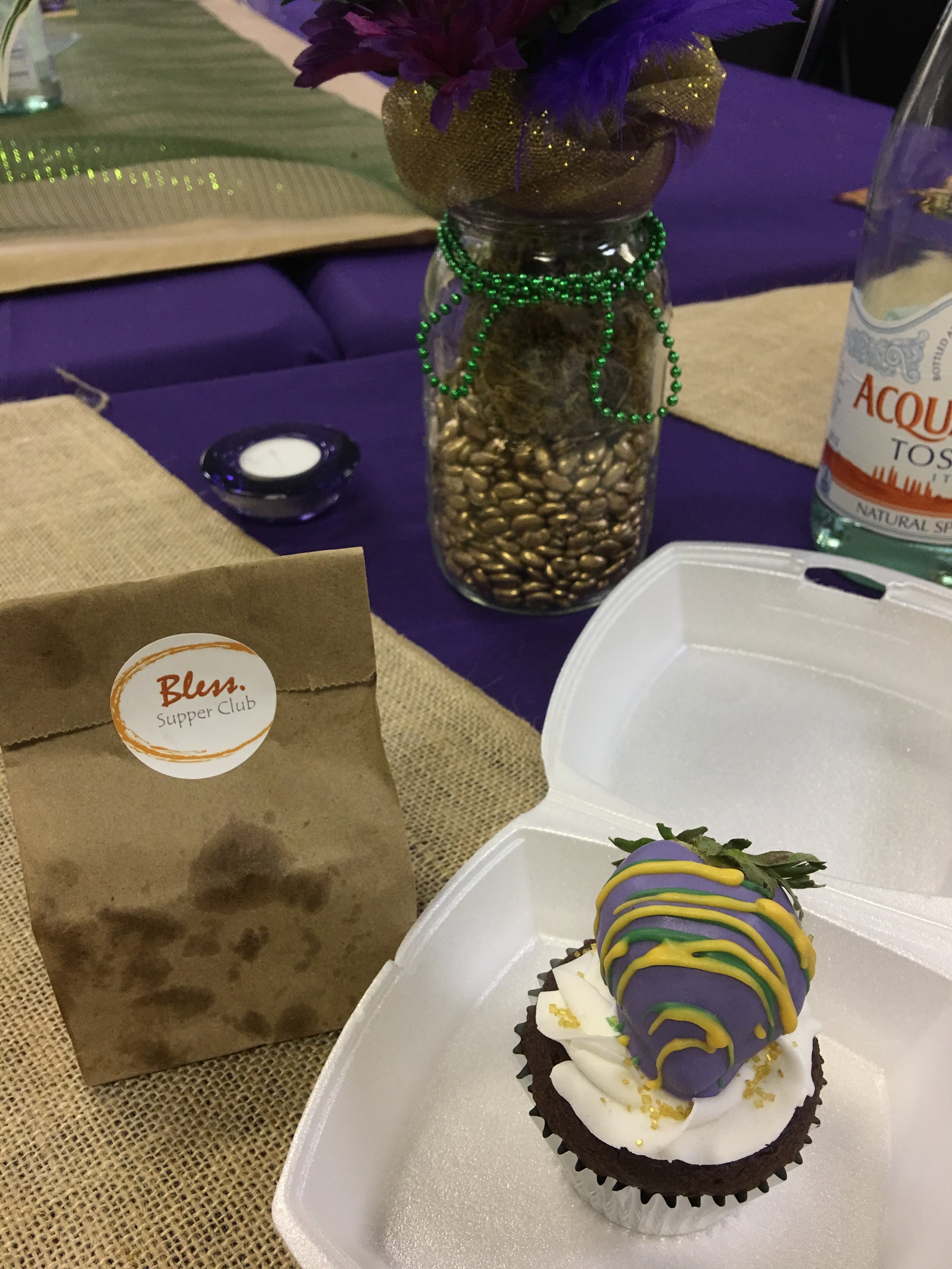 Dinner was finally complete and it was time dessert. Tonia made delicious butter pecan cookies that she placed in little brown paper bags sealed with Bless.Supperclub stickers for guests to take home. I don’t know how she made them but they were so good that a few people made special orders for more, including myself. Along with the cookies, there were also cake and cupcakes. They were made by Liz Vazquez (owner/operator of LV Confections & Catering). She made a Mardi Gras themed cake and cupcakes topped with beautifully decorated strawberries.