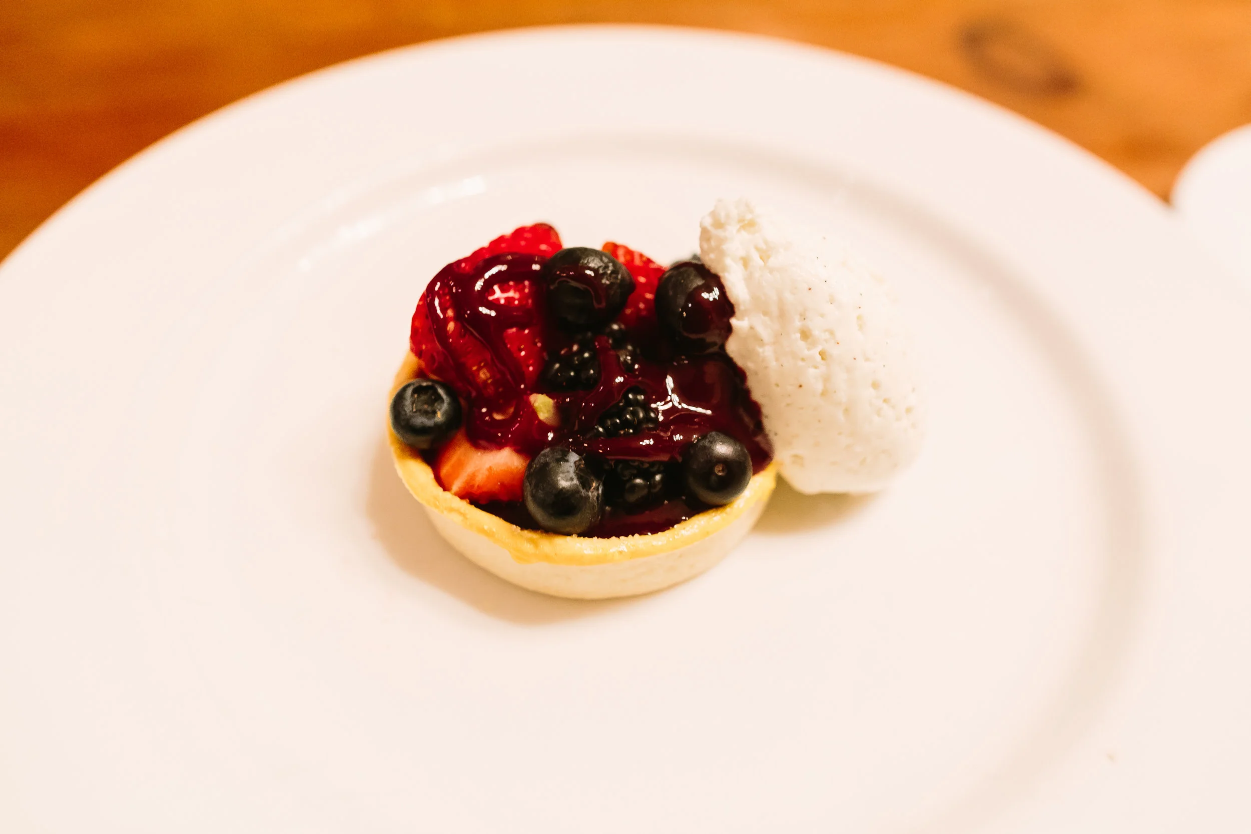 Kenneth Bush explained that Tartiflette is from the region of France known as Savoie, it is an alpine region. Savoie is close to the French alps where the French and Swiss alps boarder each other. Tartiflette comes from this region. Chef Kenneth Bush noted that he paired the Tartiflette with other traditional food from the Savoie region. Now it was time for the main course, the Tartiflette. This gorgeous family style dish is made with an entire wheel of reblochon cheese, cooked potatoes, cream, caramelized onions, bacon and about 4 ounces of Savoie wine. The wine adds the flavor and tradition to the dish. It also came with a side of haricot verts. The tartiflette is very much a plentiful dish, so be sure to bring your appetite! If you still have a little space in your belly after enjoying the Tartiflette, you have to squeeze in room for dessert. You'll be served a beautiful Tarte aux Fruits des Bois. This is a mixed berry tart.