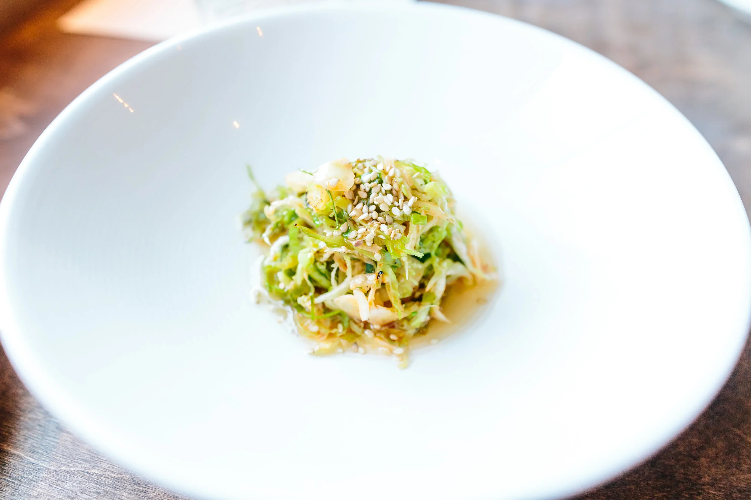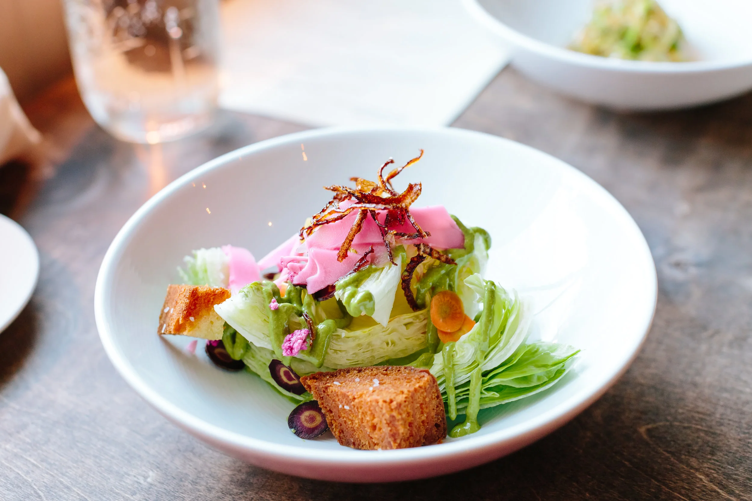 To begin dinner, Brussels Sprouts Three Ways with Spicy Sriracha Vinaigrette & Sesame Seeds and Iceberg Salad with Crispy Shallots, Pickled Cauliflower, Carrots, Croutons & Creamy Herb Dressing were served. I really enjoyed the Brussels Sprouts. The presentation was great and the flavor from the sriracha vinaigrette was delicious. It wasn't spicy at all. Brussels sprouts are actually my top favorite veggies to eat. Dinner was off to a great start. The salad was colorful and also tasty. The croutons were delicious. One nice fact about Flora is that they made all their bread and croutons in house.