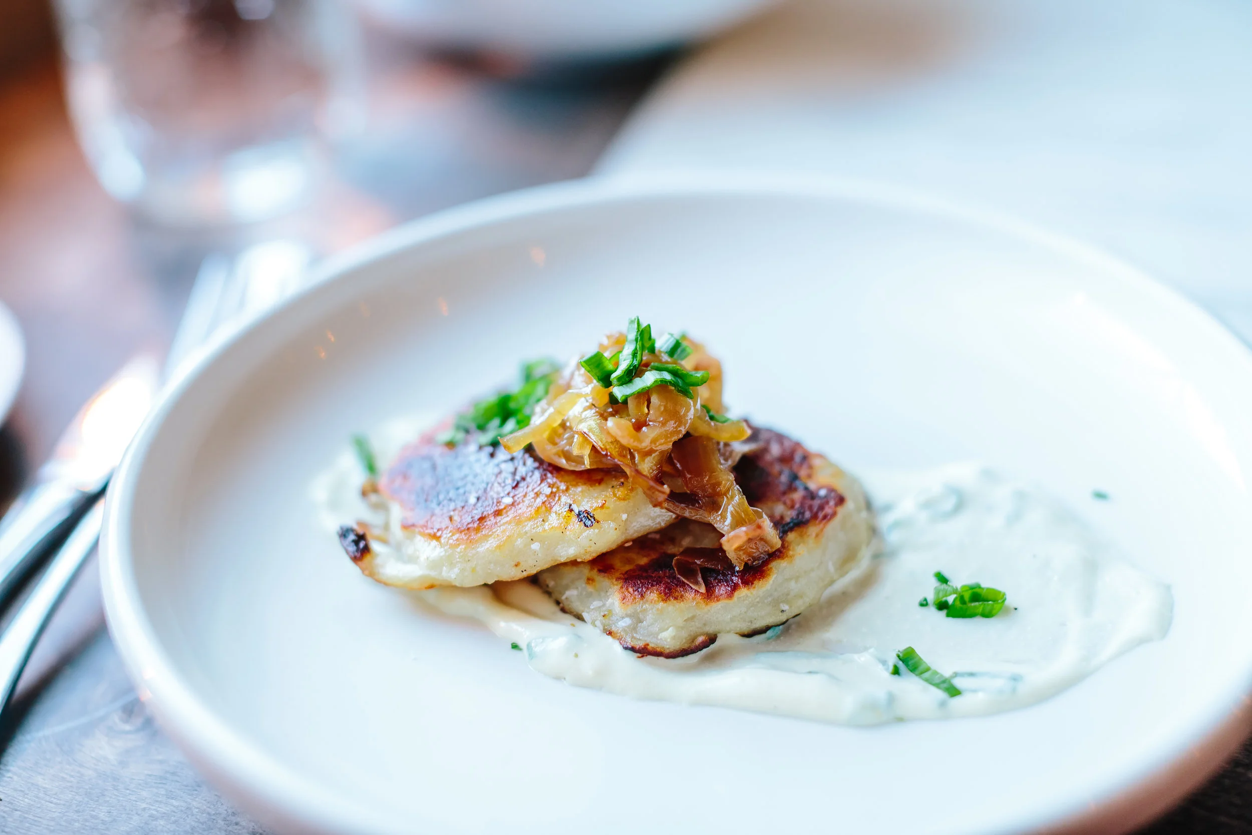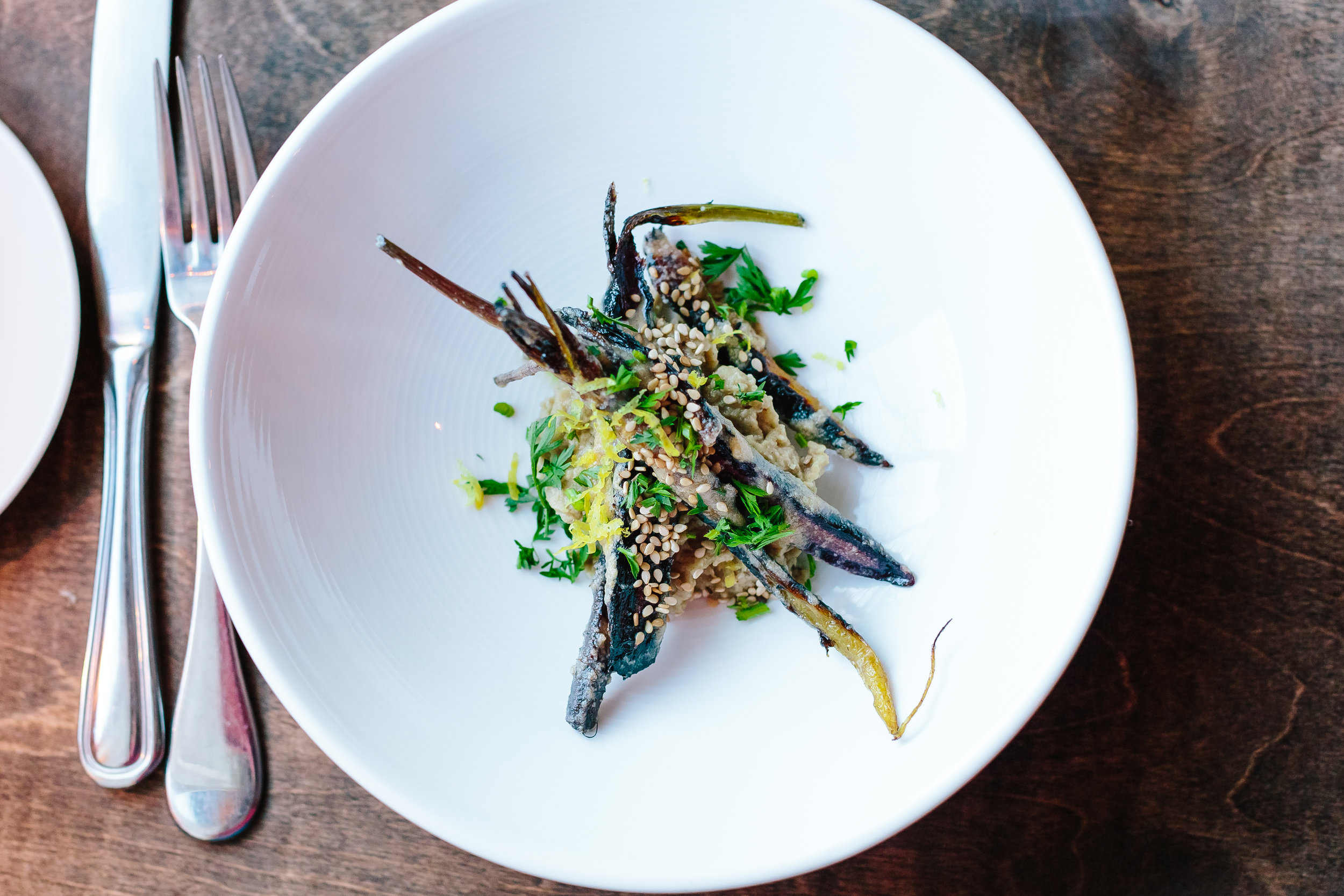 For the second course, Irish Potato Boxty with House-made Scallion Aioli & Caramelized Onions were ordered along with seared Tahini Carrots with Smoky Baba Ganoush with Lemon Zest and Toasted Sesame Seeds. Oh my goodness...the Irish Potato Boxty dish was excellent. I'm not sure how the potatoes were prepared. All I know for sure is that the chef did a wonderful job with the flavors of this course. It was so good that I wanted to lick my plate. But I didn't, I contained the urge. The aioli was a great touch to it as well. The seared Tahini Carrot dish was beautiful. Yet again, another dish with a great presentation. I enjoyed smelling the smoky aroma coming from the plate. The flavor of the smoky baba ganoush was delectable and the textures of this dish were lovely.