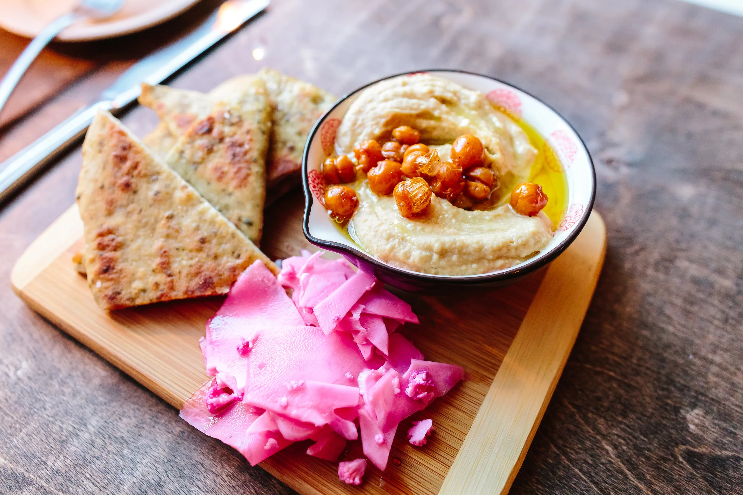 A little over a week ago, I had a wonderful experience dining at my first Vegetarian restaurant, Flora (located at 307 York Road, Jenkintown PA 19046). I was invited to view their Spring menu. Their menu changes seasonally. Since this would be my first time experiencing a vegetarian dinner, I was extremely anxious to see what would be served. A little healthy food is always good for the body, right? As soon as I entered Flora, I immediately thought that it had a lovely, intimate atmosphere. It seats about 16 people and it is also a BYOB restaurant. I’m a huge fan of BYOB places, but this evening I decided to keep it simple and quench my thirst with good ol’ water. Another thing that caught my eye was the lovely logo that was painted on a wall in the dining area. Flora was spelled on the wall with vegetables surrounding its name. It was a nice touch to the decor.