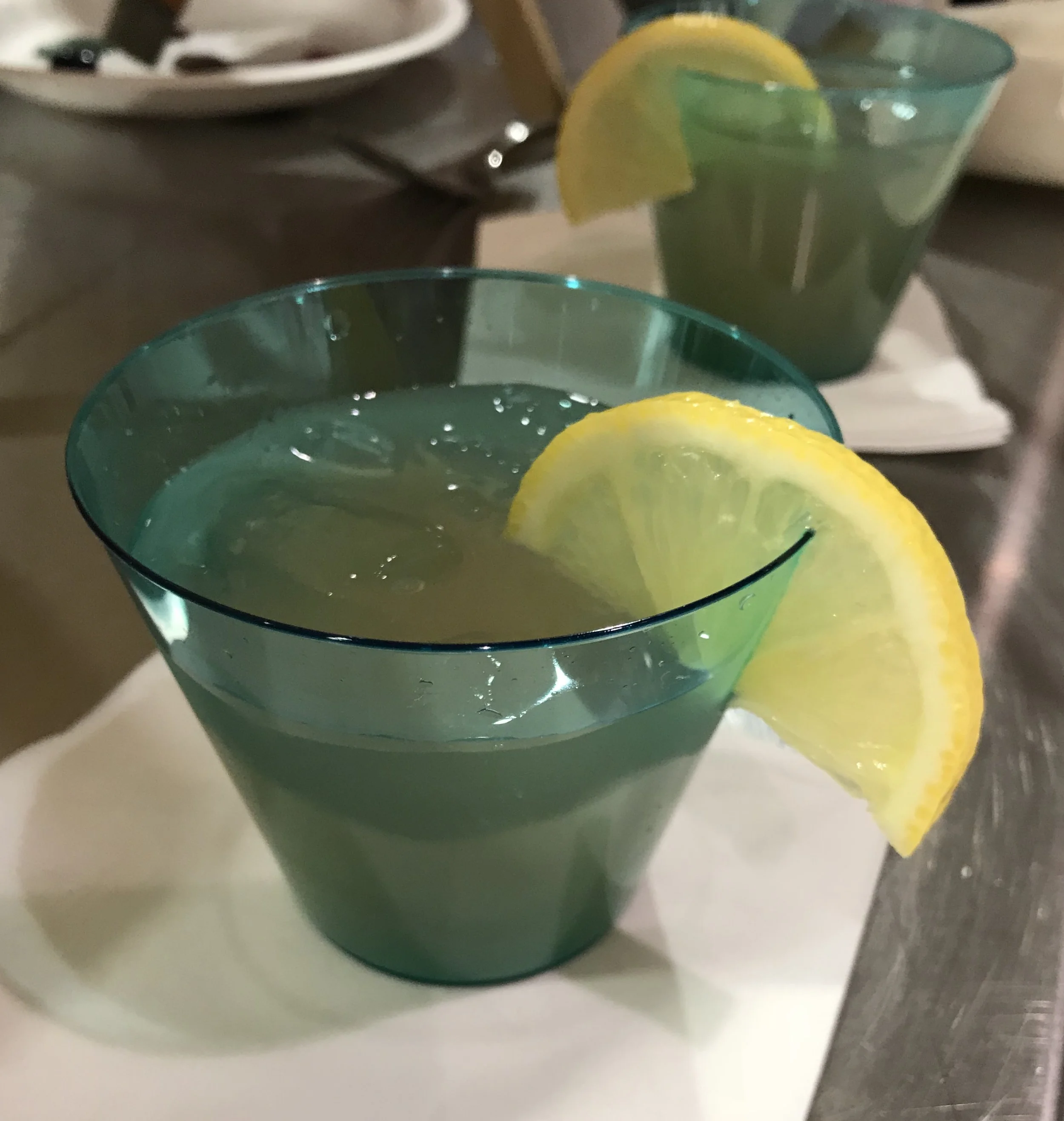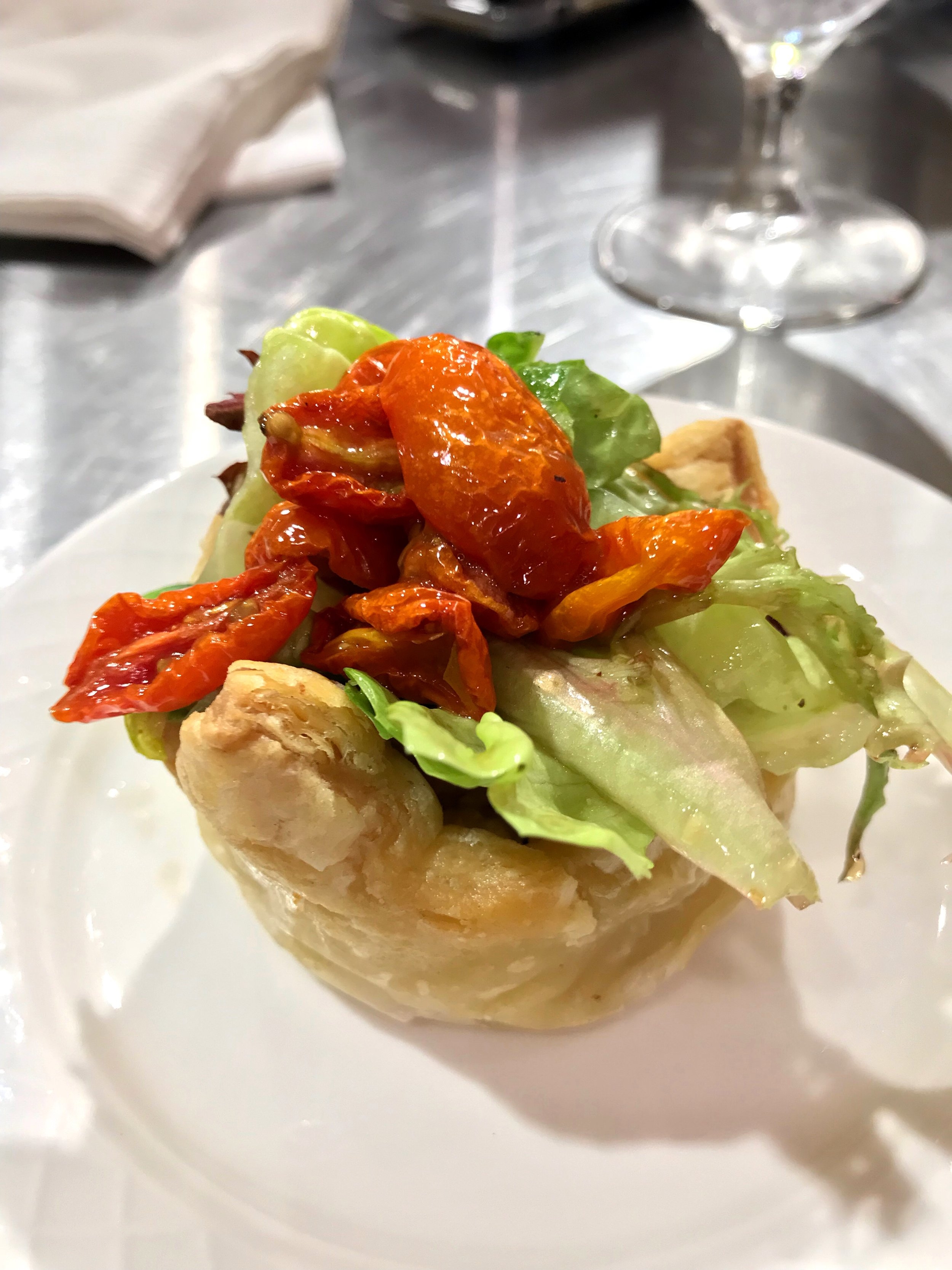 The first course was prepared and on it's way out. We were served a puff pastry with cream cheese, oven dried tomato and a vinaigrette. A similar pull pastry was served at a pervious event, but this one had a different spin to it. Another guest and myself were very happy to see this featured. The texture was fluffy, creamy in the middle and the garnish on top gave it a little crunch. Libations were also served during this event. I made sure to indulge on one on two, yummy.