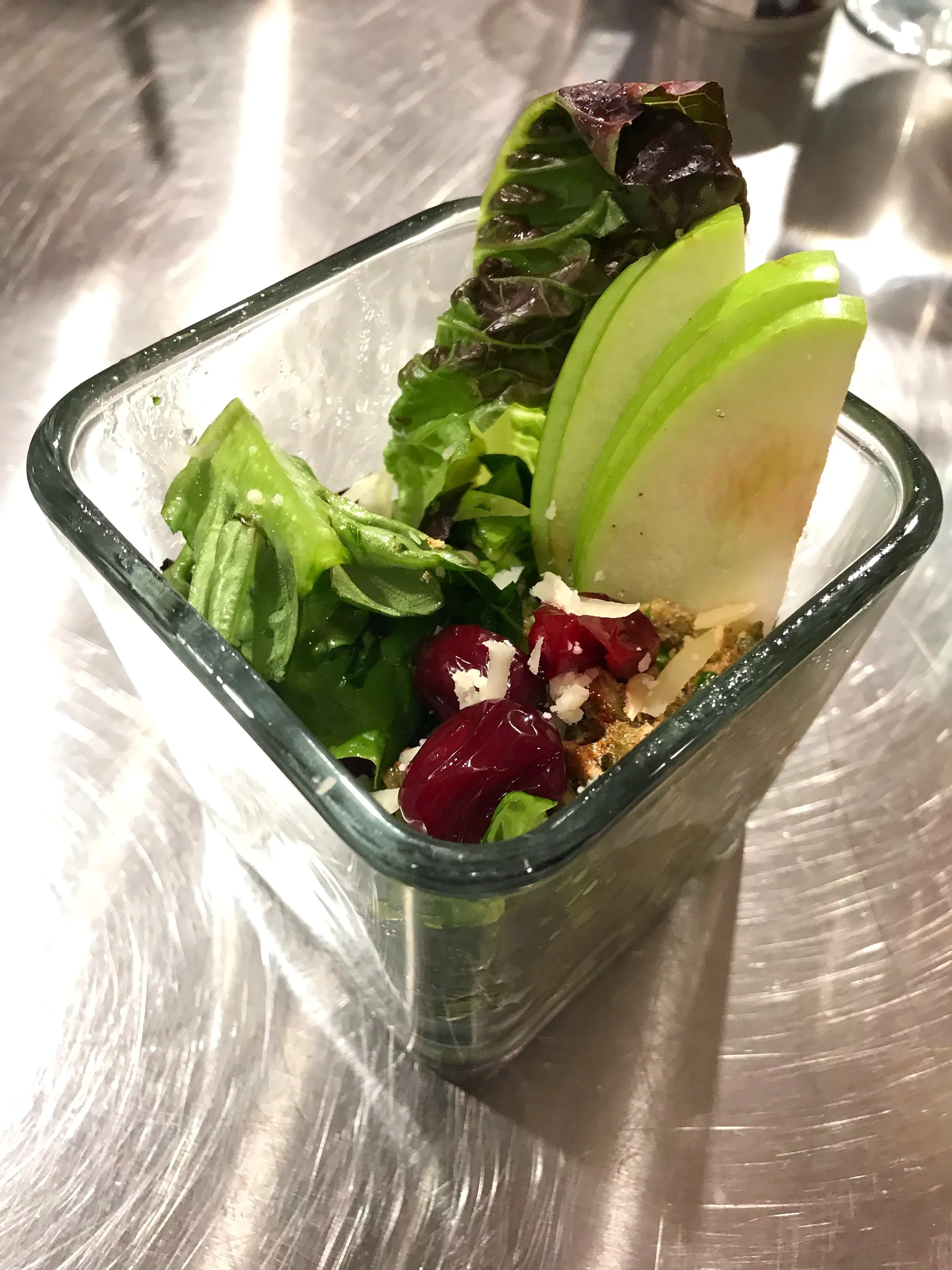 Coming up next was the second course. Chef Dana created a Pear Soup with blueberries, pomegranate seeds and a touch of prosecco. It was also topped with a long whole grain crouton with raisin butter and blue cheese. Honestly, I've never experienced anything like this before. The prosecco added sweetness and the pomegranate seeds were a nice addition. I LOVED it! The only thing missing were four more bowls with my name on it, haha! This was different and I enjoyed every spoonful of it. On to the third course. We were served a pumpkin salad with cranberries, apples, candied pumpkin seeds and gruyere cheese. The dressing was an apple cider vinaigrette. The ingredients all blended perfectly together. It was a mildly sweet salad and the apple cider vinaigrette gave it a nice balance.