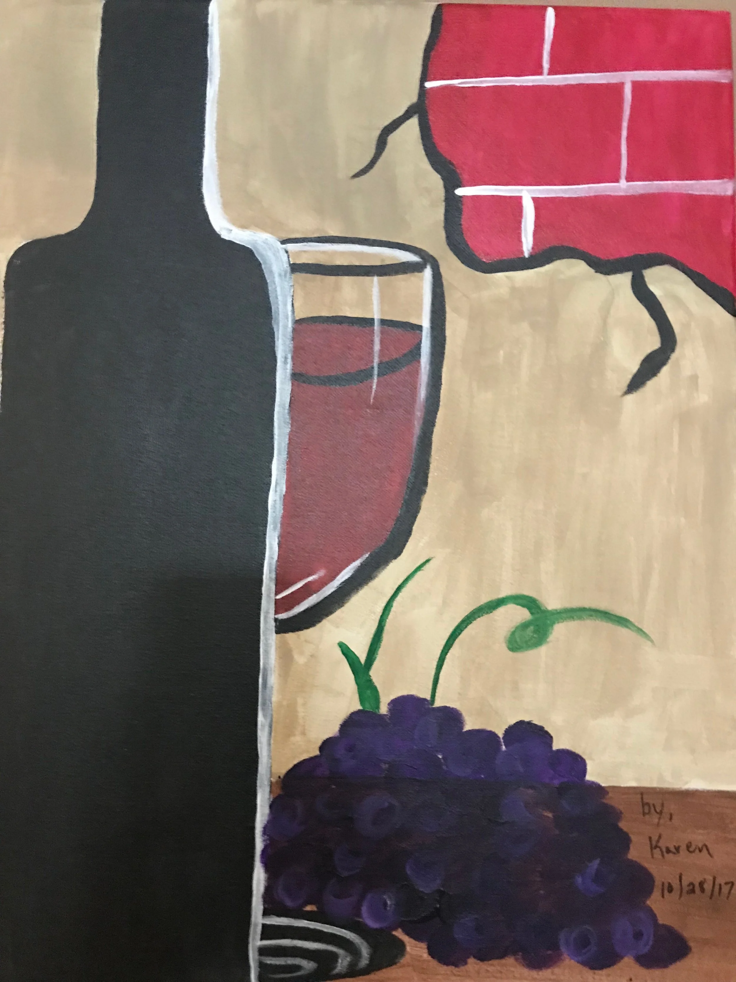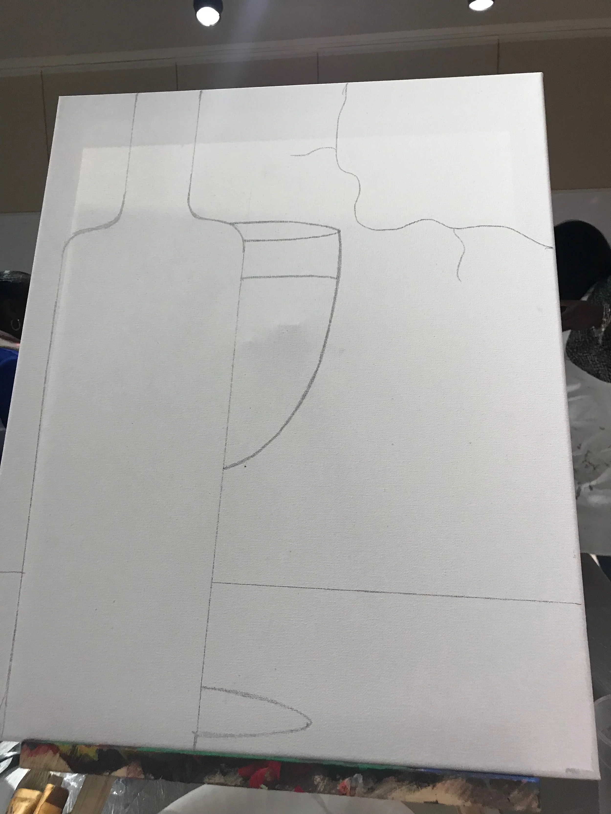 As the event began, we started with our canvases. They were prepared traced with the image of a wine bottle, wine glass, grapes and small opening in the wall. Our paint was given to us and it was time to create something beautiful!