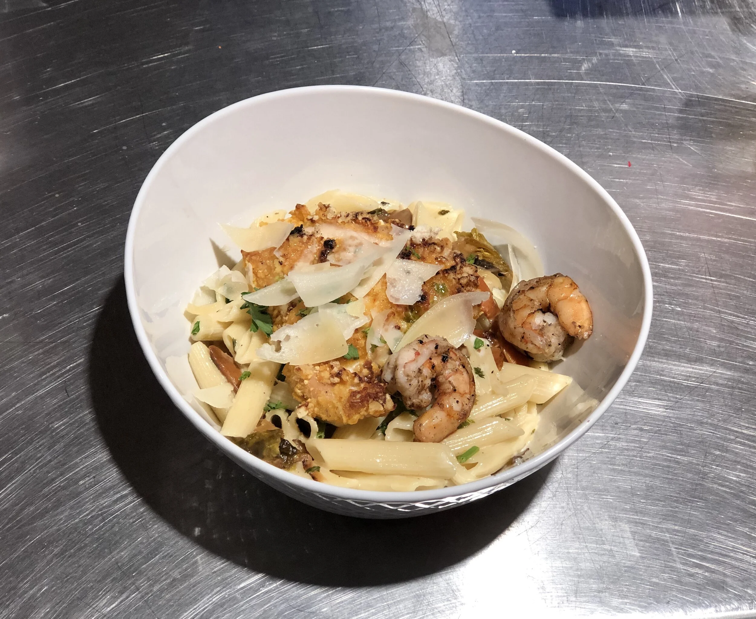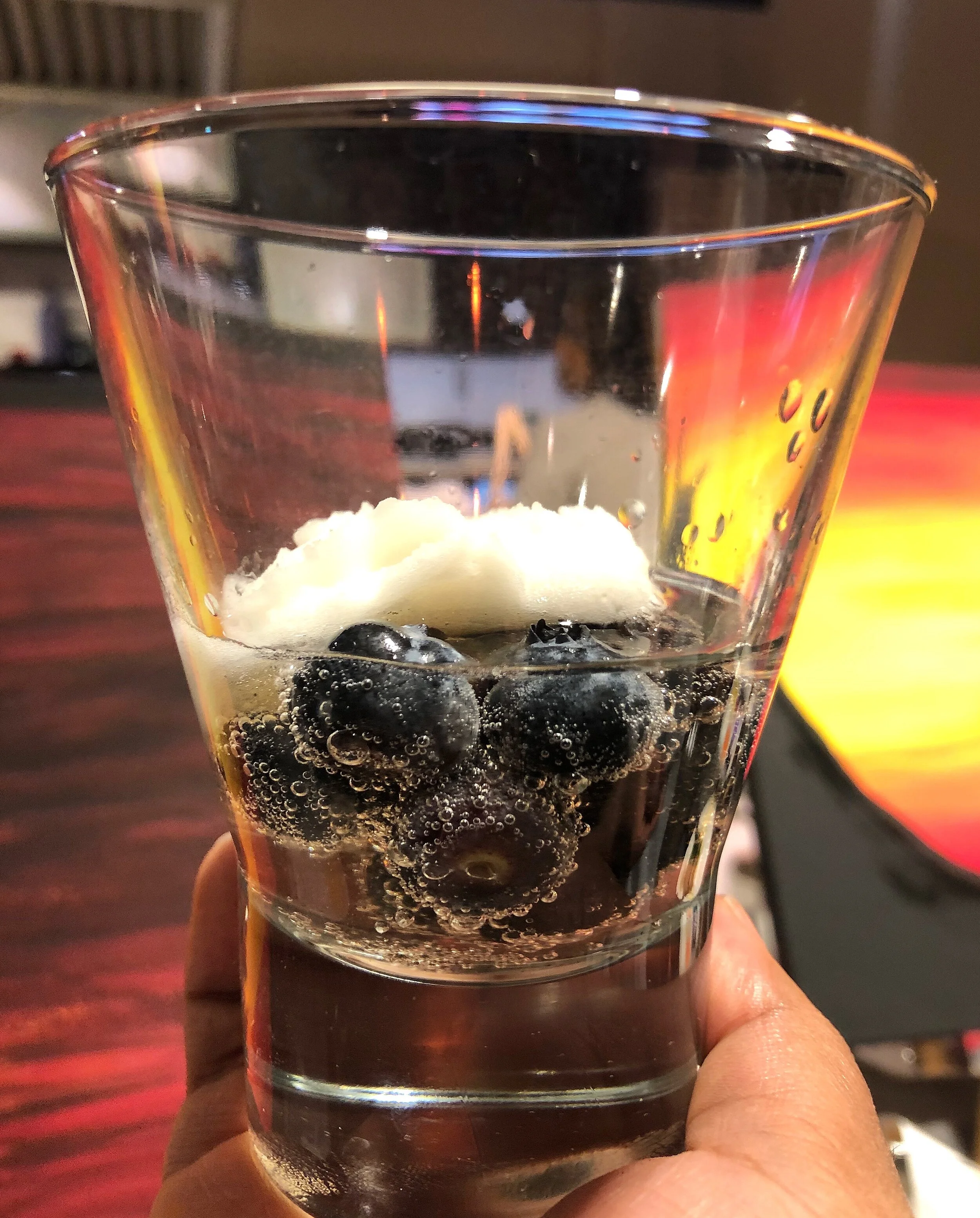 Next was a palette cleanser for the 3rd course. It was a lemon sorbet with fresh blackberries, blueberries and a sweet white sparkling wine. This was very refreshing. The berries and bubbles were a tasty touch to the sorbet. The 4th course came in two options. If you eat meat, you were served a Corn Pops Crusted Chicken entree over penne pasta with a white chocolate alfredo sauce, shrimp, onions, carrots, celery, brussel sprouts, spinach, parsley and shaved parmesan cheese. If you did not eat meat, you were served a version of this dish with seared cod fish and shrimp. Both were excellent! The fish was cooked perfectly, it was also a generous portion. The chicken was very interesting, in a good way! I would’ve never thought to use Corn Pops to coat chicken. I must say this was a GREAT idea! It gave the chicken a nice crust with a touch of sweetness to it. For the last and 5th course, we were served a Chocolate Creme Brûlée with black cherries and lady finger. All I can say is this was a beautiful ending to such a wonderful and filling dinner! The creme brûlée was rich, creamy and delicious. I finished every bit of it!